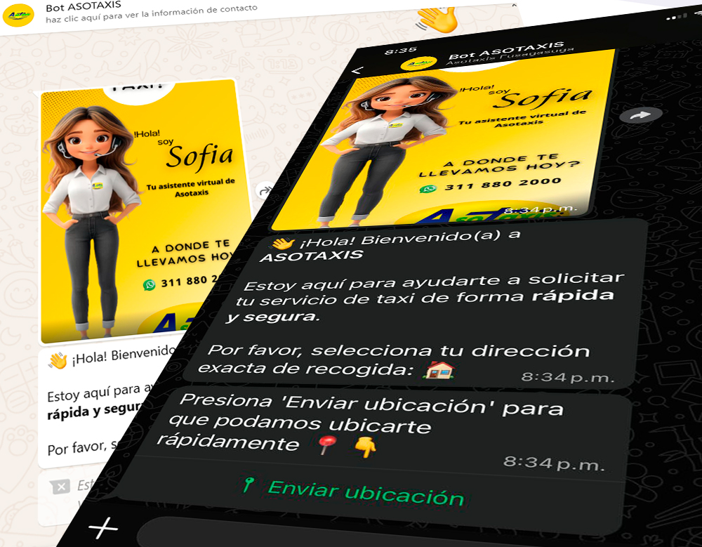 CTAs visibles a WhatsApp y a la App Asotaxis Fusa en Google Play para pedir taxi y hacer seguimiento.